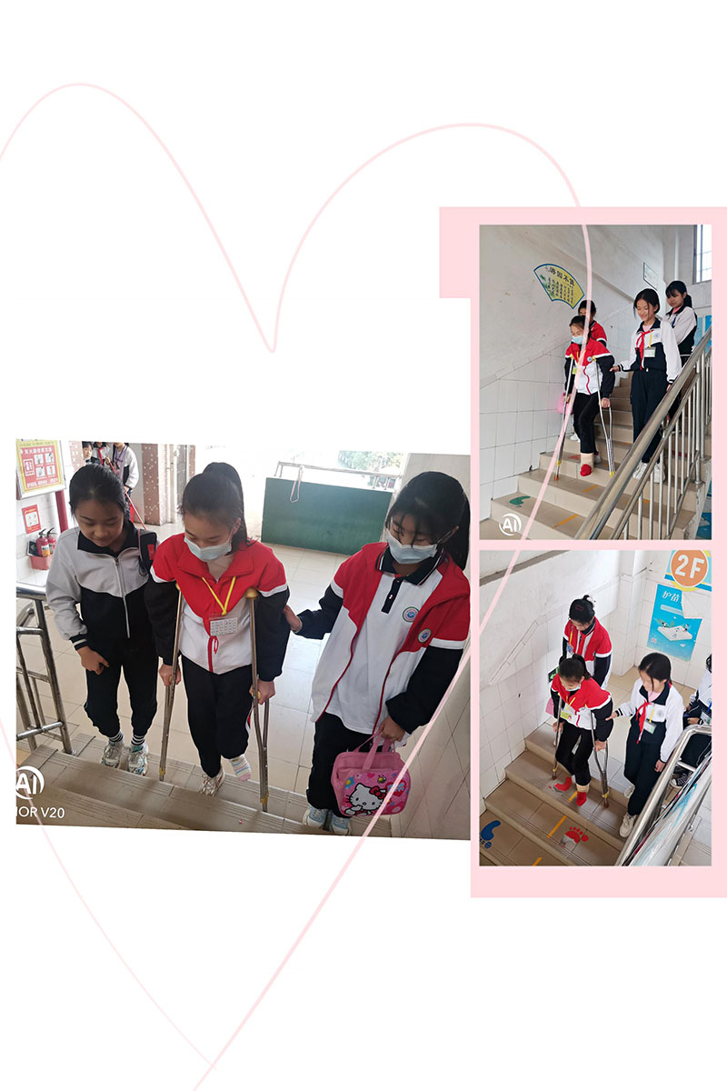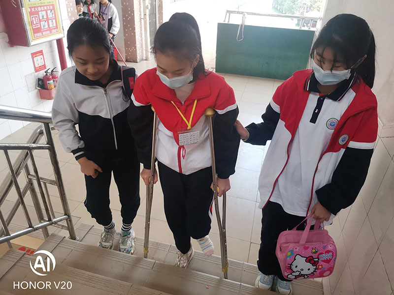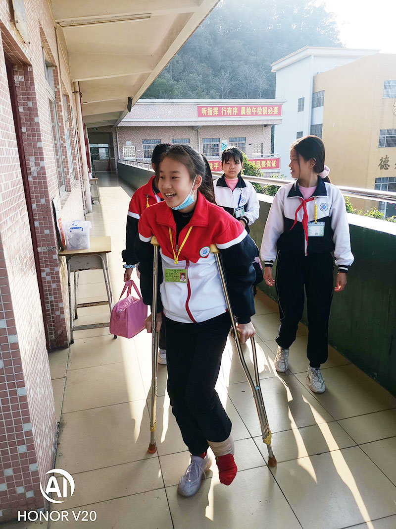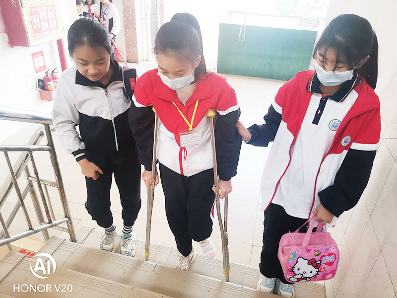 本学期,五(5)班来了一位“特殊”的同学,因在寒假期间与朋友玩耍的过程中,不慎将左小腿处摔骨折了。班主任了解情况后,立即安排同学们帮助她。每天,同学们都会帮助她提书包、帮她打饭菜、帮忙搀扶上下楼梯......一幅幅暖心的画面让这个班集体更加充满了“爱”。
