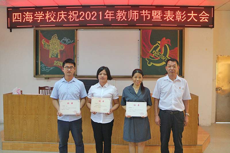 王校长宣读了《市、镇、校三级关于表彰2020--2021学年优秀教师的决定》,《决定》授予王凤兰老师“中山市优秀教师”荣誉称号;授予李 健英、邵伟两位老师“中山市优秀班主任”荣誉称号;授予邓海芬、郑华丽、赵小康、周想超等9位老师“三角镇优秀教师”;授予苏新霞、卜贺等4位老师“四海学校优秀教师”荣誉称号。