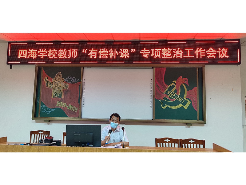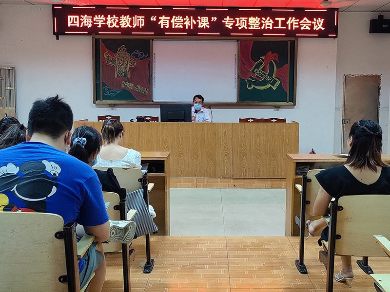 为深入贯彻落实全面深化我校在职教师有偿补课专项治理行动,从而进一步规范我校教师从教行为,杜绝教师有偿补课,维护教师职业形象,8月27日下午,四海学校组织全体教师开展了在职教师违规有偿补课专项整治会议。