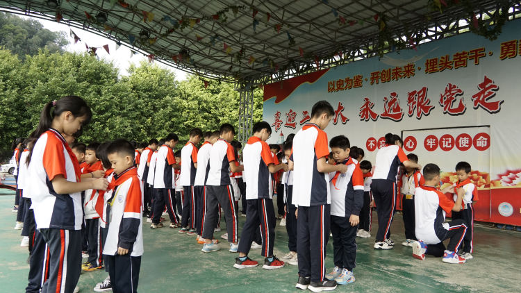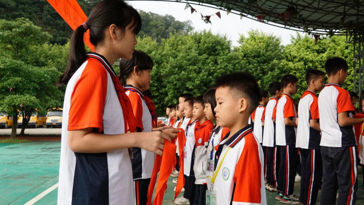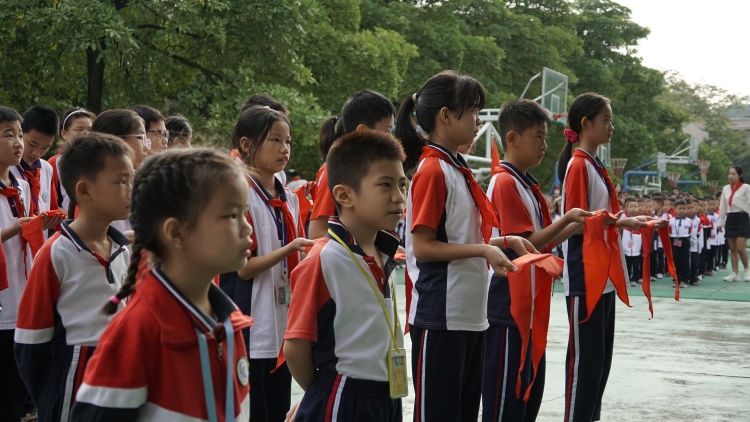 高年级的队员代表手持新红领巾来到新队员的面前,为他们戴上了鲜艳的红领巾,并给予新队员最好的祝福。