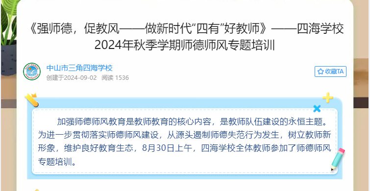 《强师德,促教风——做新时代“四有”好教师》——四海学校2024年秋季学期师德师风专题培训
