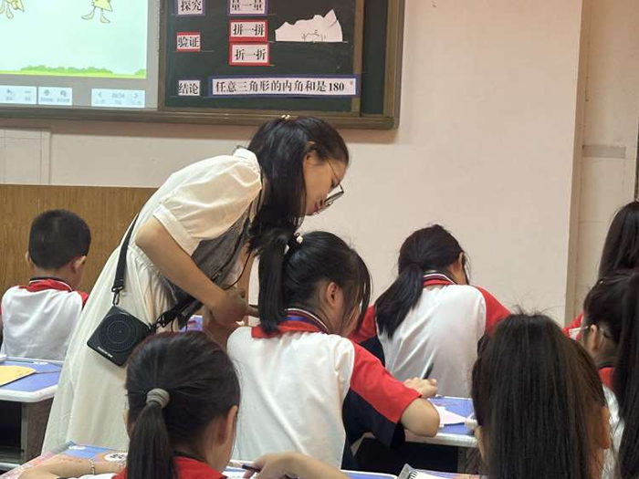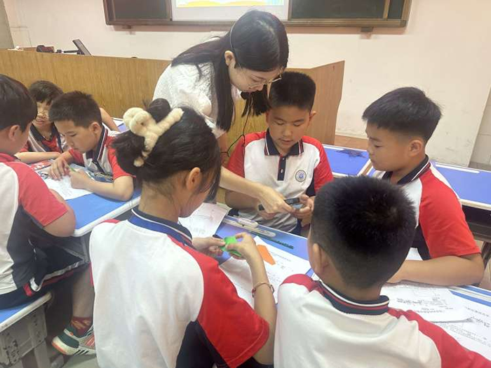 第二节,四海学校的蒋飞艳老师授课,她采用“猜一猜”、“量一量”、“撕一撕”、“拼一拼”等一系列活动,让学生在做中学,体现了以学生发展为主的教学理念,努力构建动手操作探索型的课堂模式。